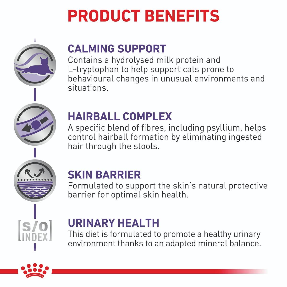 ROYAL CANIN CALM is a veterinary exclusive dry cat food specially crafted to help maintain your adult cat’s emotional balance. This diet includes calming nutrients (L-tryptophan and hydrolysed milk protein) as well as calming support for stress-related digestive upsets, skin irritations, and urinary sensitivities. A specific blend of dietary fibres, including psyllium, helps control hairball formation by stimulating the intestines to pass the hair that is swallowed. Precise amounts of B vitamins and amino acids reinforce the skin barrier and help sensitive skin. Plus, the exclusive S/O index aids urinary health by creating an environment unfavourable to crystal formation in the bladder.
