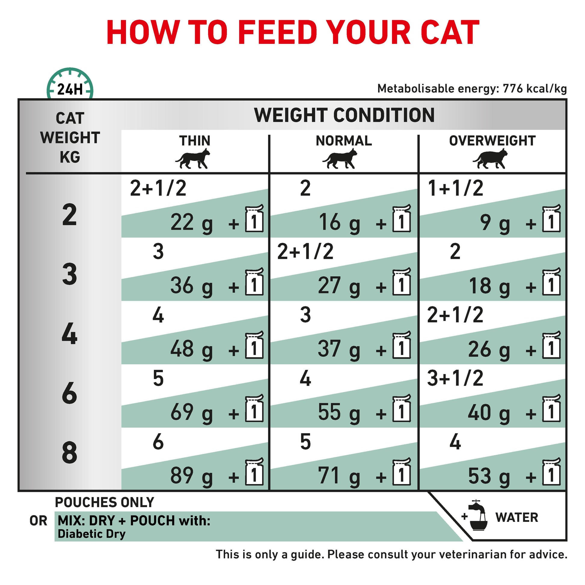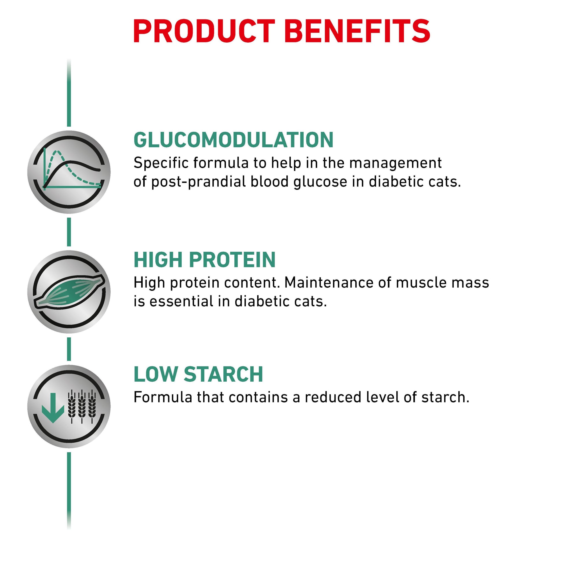 ROYAL CANIN Diabetic diet is specifically formulated to help in the management of glucomodulation in diabetic cats. A diabetic cat does not produce sufficient insulin or cannot utilise it normally, so their blood sugar levels elevate. This can cause many health issues. Eating a meal results in a rise of blood glucose levels. In diabetic cats, the goal is to maintain the levels within a safe range throughout the day. Maintaining a stable, ideal body weight is an important dietetic approach. ROYAL CANIN Diabetic diet is formulated with a low level of digestible carbohydrate and a high level of protein. The moderate fat content helps maintain a healthy body weight, while rich antioxidants help maintain health and vitality.