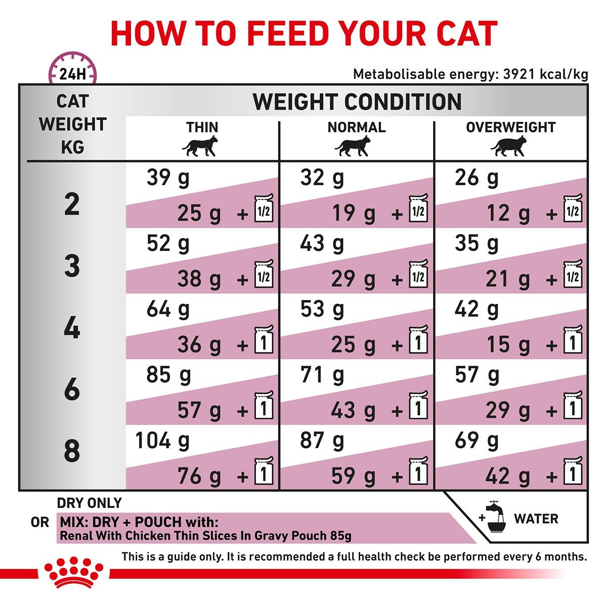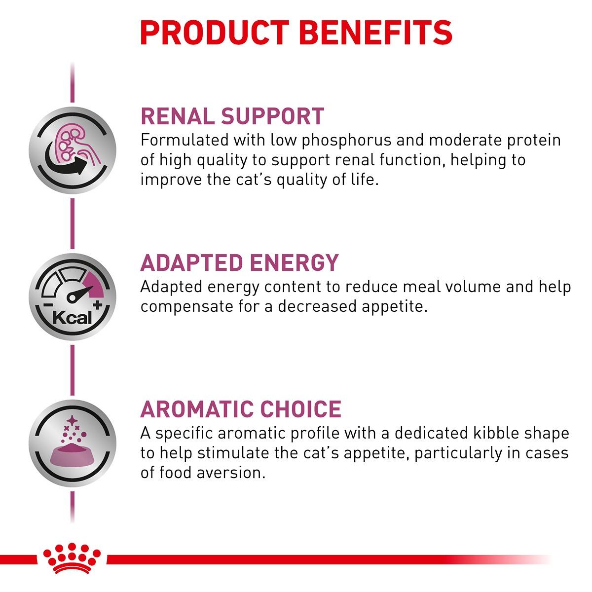 Royal Canin RENAL dry is a complete dietetic feed for cats formulated to support renal function in the case of chronic renal insufficiency, through its restricted levels of phosphorus and high-quality proteins. Renal dry is also formulated to reduce oxalate stone formation through its low level of calcium and Vitamin D, and its urine alkalising properties.