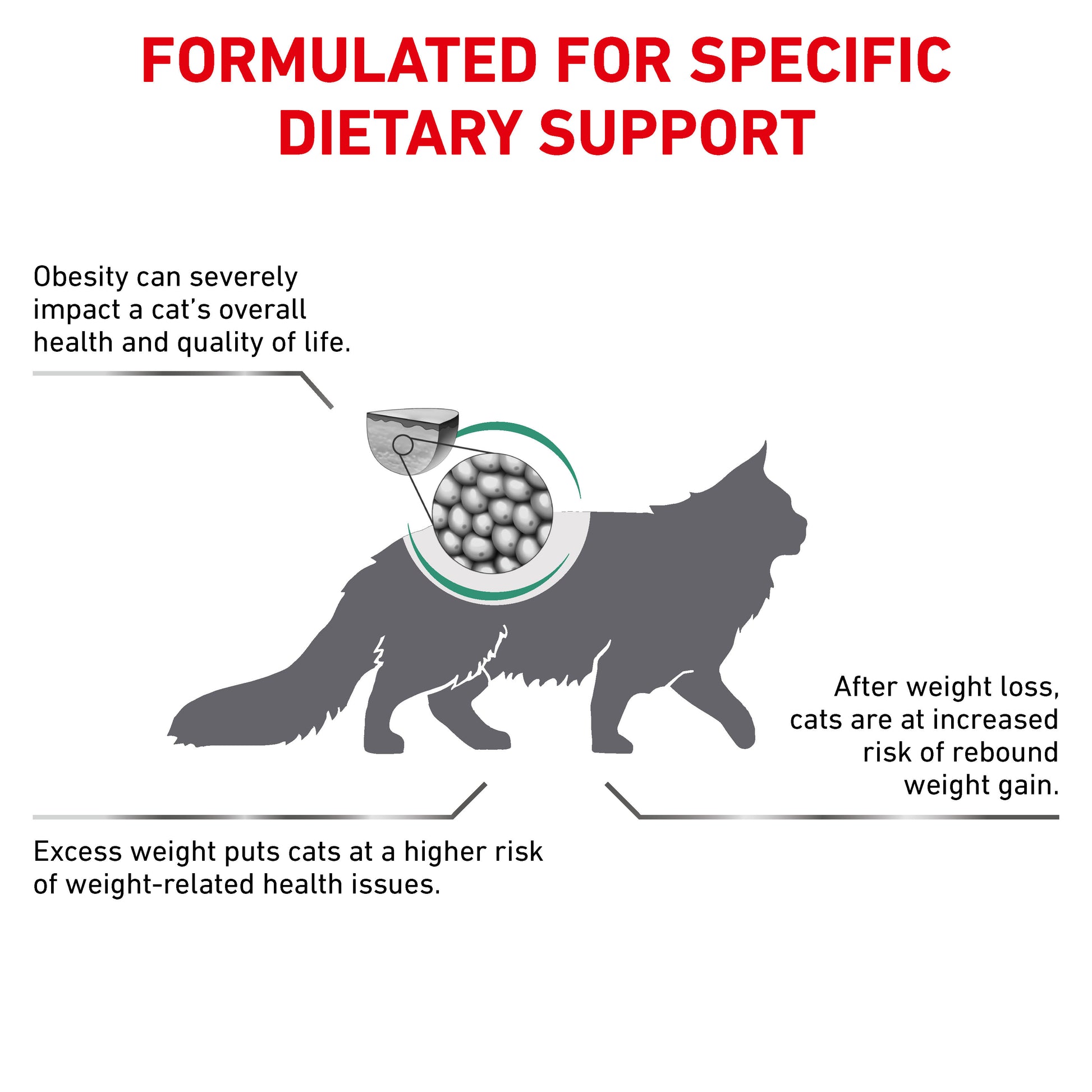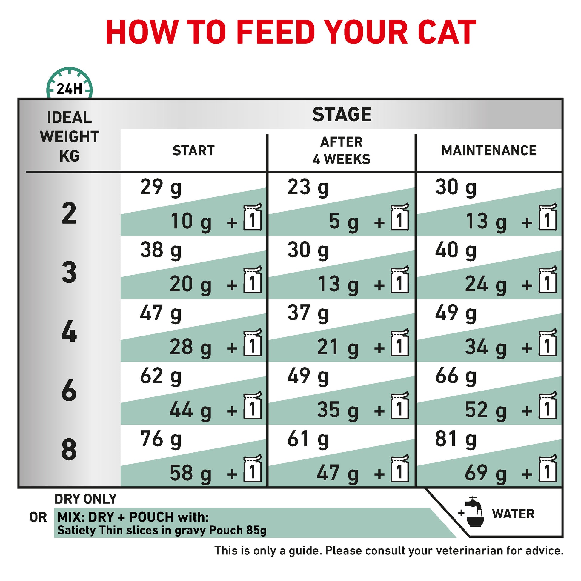 ROYAL CANIN Satiety weight management dry is a complete dietetic feed for cats formulated to reduce excessive body weight and designed to help reduce hunger. Satiety enables your cat to receive a 32% larger portion than your average high-fibre weight loss diet. This is achieved through a combination of high protein and a special blend of fibres.