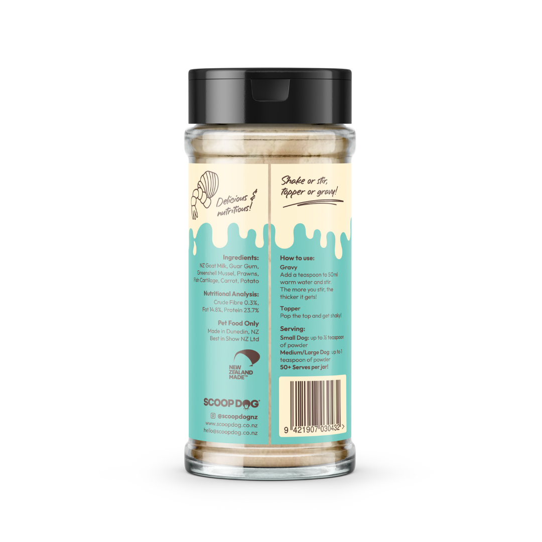 Make meal time easy with the Scoop Dog Shaker. Scoop Dog have created the Seafood Chowder flavour to give your pooch a taste of the iconic Kiwi classic. Not only does it contain a delicious blend of premium, all natural ingredients - its so easy to use! You can feel good about adding the Shaker to your dogs day.This clever product is so versatile and easy to use. A delicious sprinkle-over meal topper or mix with water for a thick, creamy gravy. Treat your dog to this delicious and nutritious creation and make meal time the best it can be!