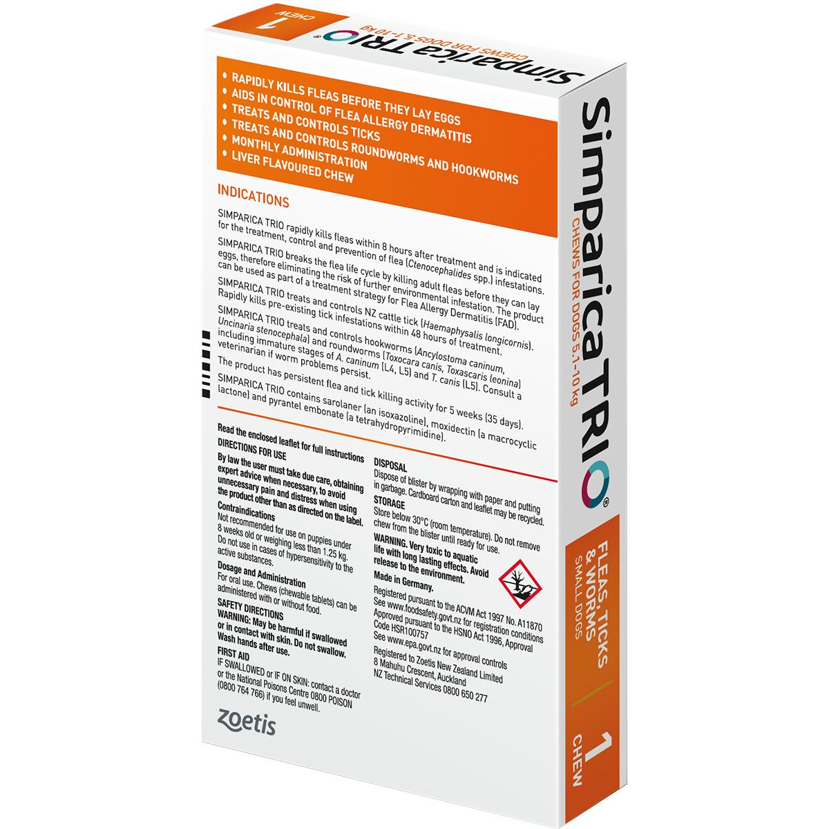 Simparica Trio Chew Fleas, Ticks and Worm Treatment for Small Dogs 5.1-10kg