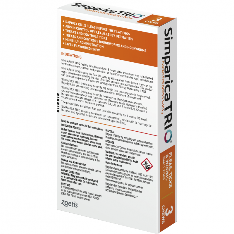 Simparica Trio protects your dog against fleas, ticks, worms and mites from 8 weeks of age and 1.25kg. Simparica TRIO works fast and lasts – killing fleas within 8 hours after treatment, and is effective against fleas and ticks for 5 weeks. This means you can be confident that easy once a month dosing provides protection for the full month.
