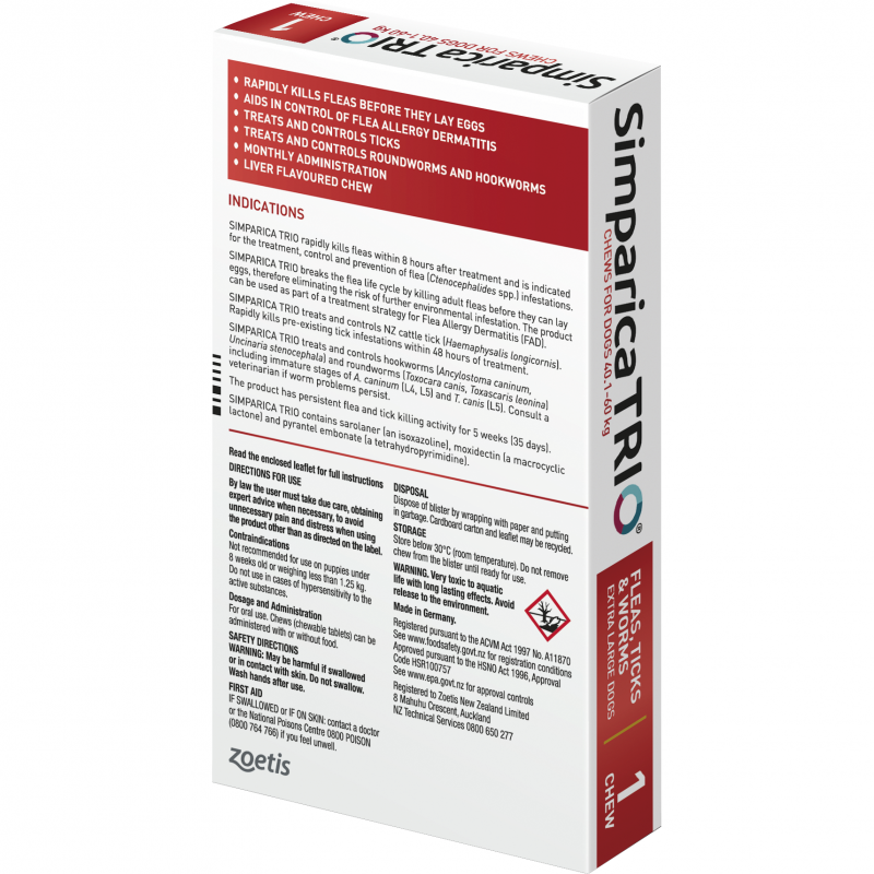 Simparica Trio protects your dog against fleas, ticks, worms and mites from 8 weeks of age and 1.25kg. Simparica TRIO works fast and lasts – killing fleas within 8 hours after treatment, and is effective against fleas and ticks for 5 weeks. This means you can be confident that easy once a month dosing provides protection for the full month.