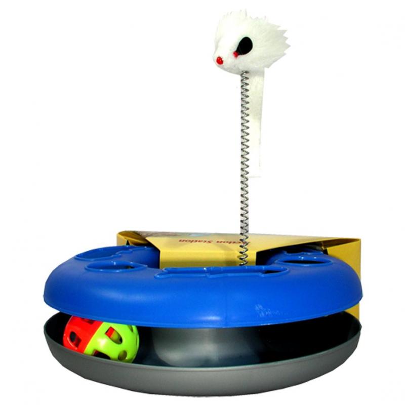 Between the two levels is a plastic ball with bell which moves freely. As well as batting the ball through the sides, they can also use the fun-shaped holes to reach the ball. As a added bonus, on the top is a flexible metal spring which has a mouse for added fun and games.