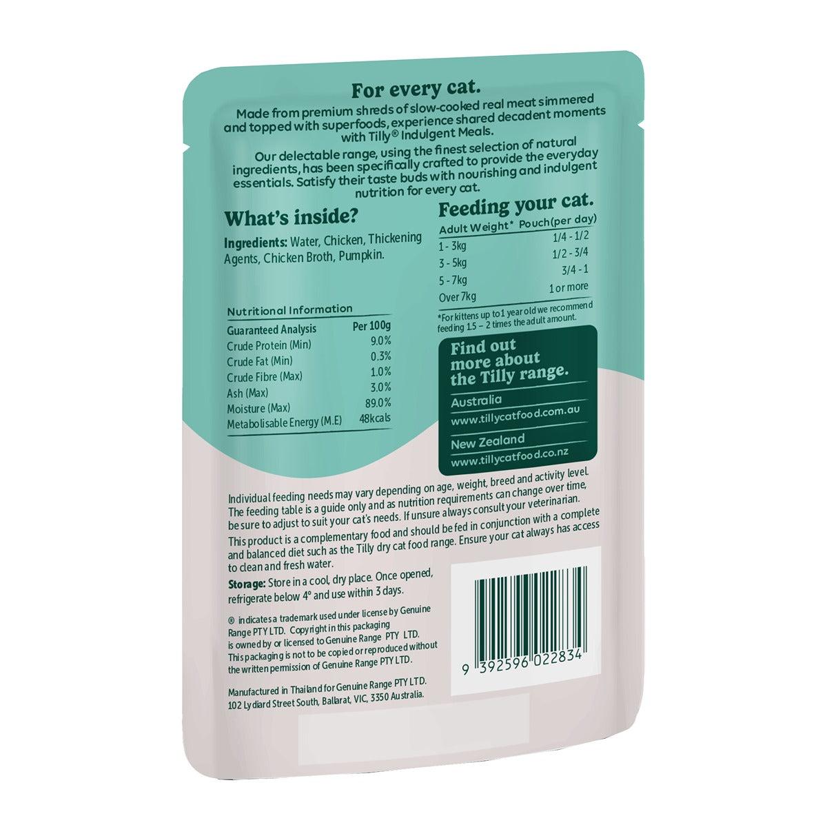 Made from premium shreds of slow-cooked chicken simmered and topped with pumpkin, experience shared decadent moments with Tilly Indulgent Meals. Our delectable range, using the finest selection of natural ingredients, has been specifically crafted to provide the everyday essentials. Satisfy their taste buds with nourishing and indulgent nutrition for every cat.