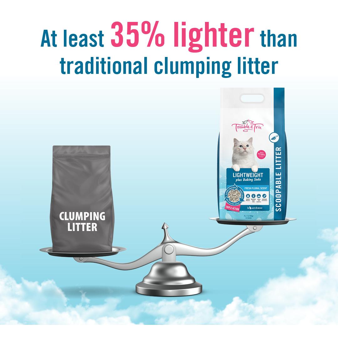 The Trouble & Trix Lightweight Clumping Cat Litter with Baking Soda is a premium, super absorbant litter that is 35% lighter than other clumping litters. This makes it much easier to carry around and to refill the litter tray. The baking soda formula helps to trap liquid and to neutralise urine.