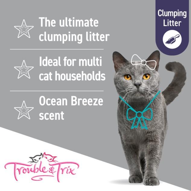 Combining the power of carbon, baking soda and zoelite, Trouble & Trix Ultra-Scoop litter is the ultimate in odour control and ideal for multiple cats. The litter is long-lasting and convenient and fresh, with a light 'ocean breeze' fragrance.